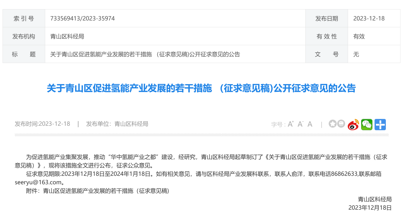 12月18日,青山區科經局發布《關於青山區促進氫能產業發展的若幹(gàn)措施 (征求意見稿)公開征求意見的公告》。